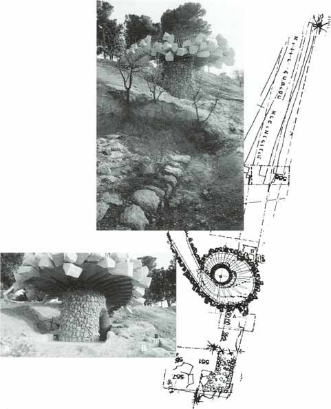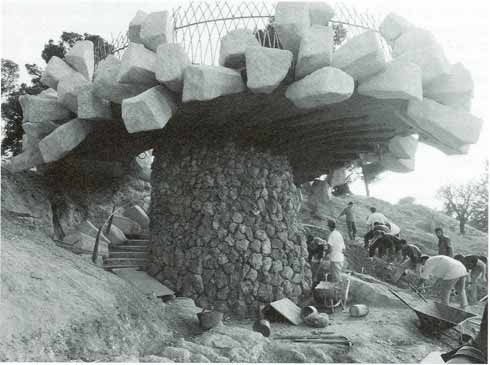 Figure 8. Spiral Viewpoint, stages in the construction, September to November 1998. The ‘artificial’ stones were fabricated using the powder of the natural bedrock (from which the ancient building blocks were carved) and then welded to the structure. Some have been filled with earth to grow hyssop (transplanted from the near vicinity).