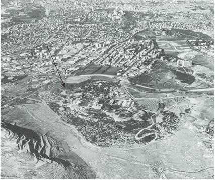 Figure 3. Aerial photograph of the mountain of Ramat Rachel looking north (November 1996) with the city of Jerusalem in the background (the location of the Spiral Viewpoint is marked with an arrow).