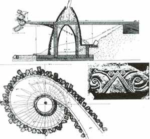 Figure 7. Spiral Viewpoint, plan and section and Protoaeolic capital from Ramat Rachel (now in the Israel Museum). Ten such capitals were found at the site, of a total of 35 found in Israel. A tenuous connection may be observed between this major symbolic element of the site and the plan of the Spiral Viewpoint.